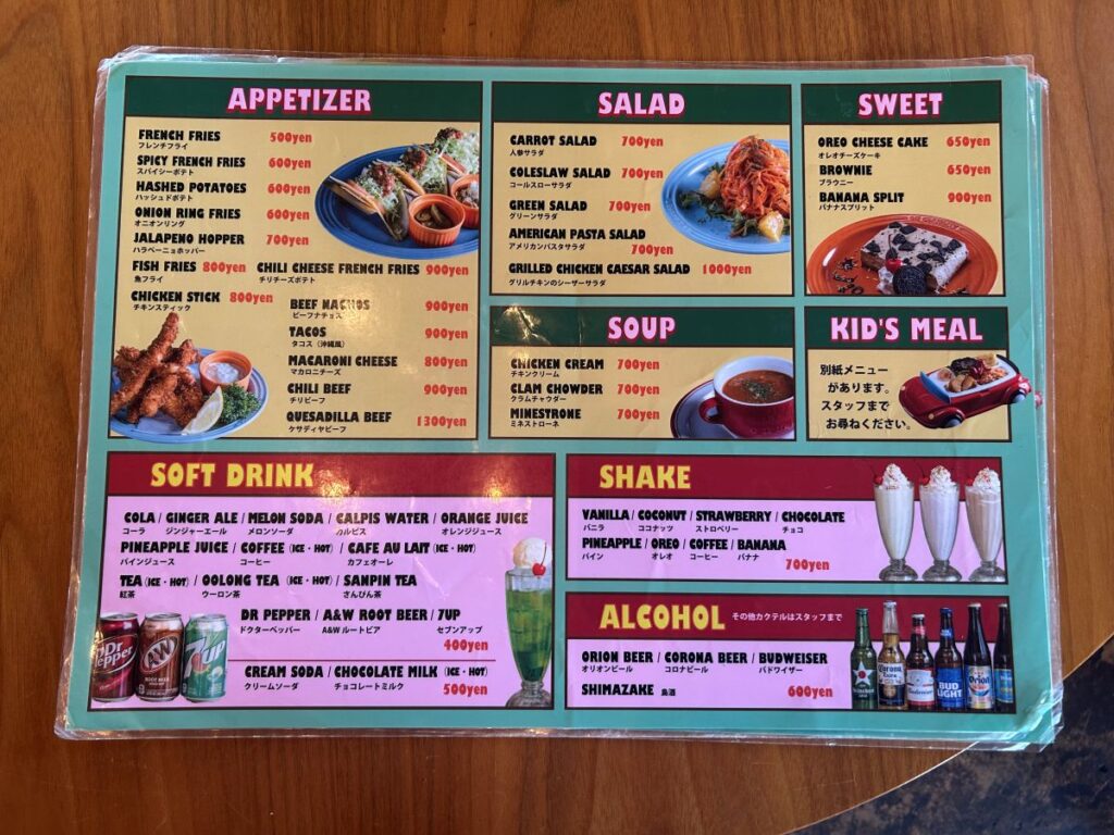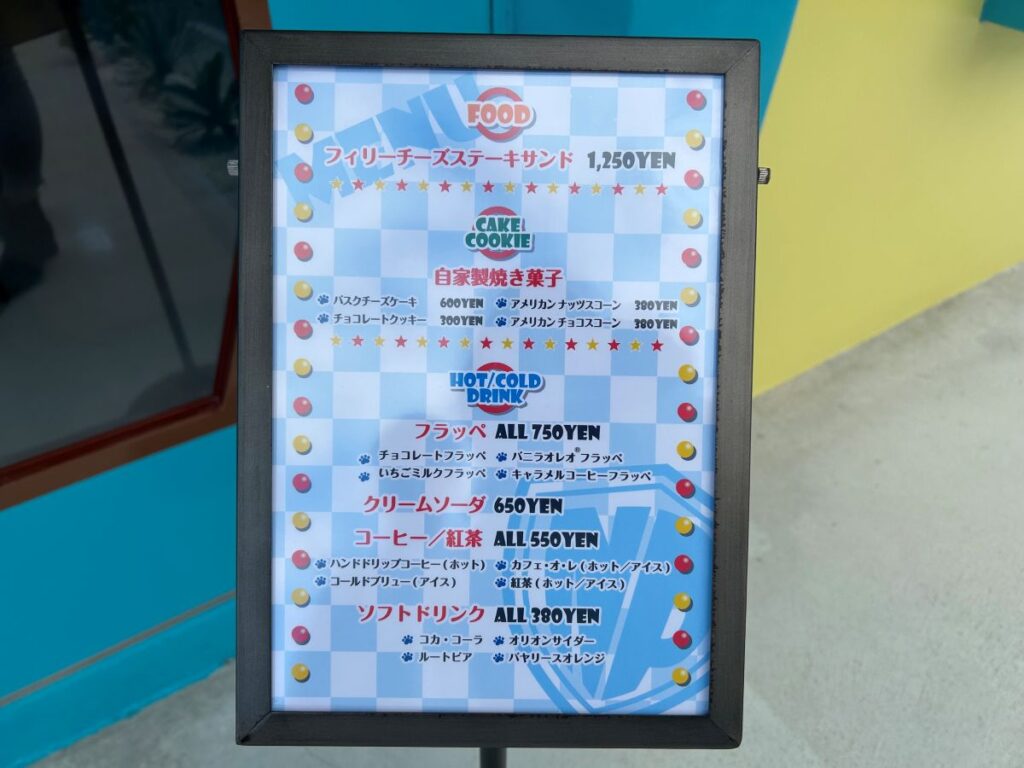 グランドオープンしたばかりのアメリカン雑貨カフェです。カラフルな外観はまるでテーマパークのような雰囲気で、入り口近くにメニュー表が設置されており、見やすく選びやすい構成になっています。