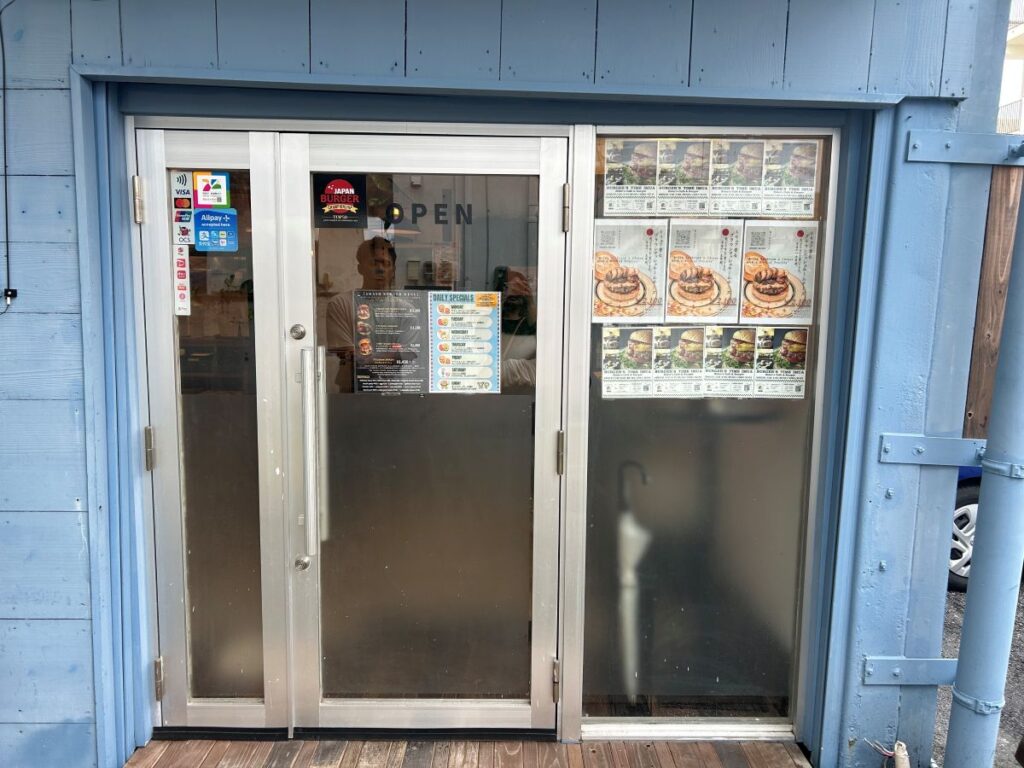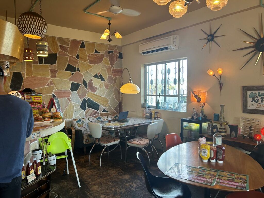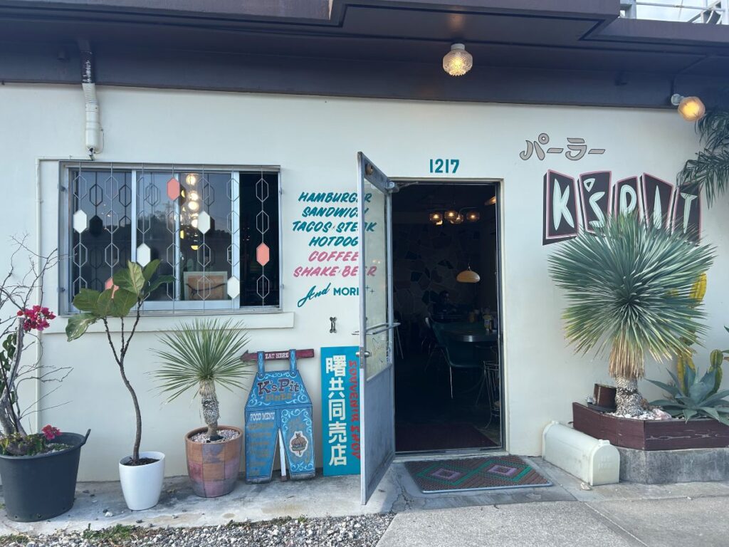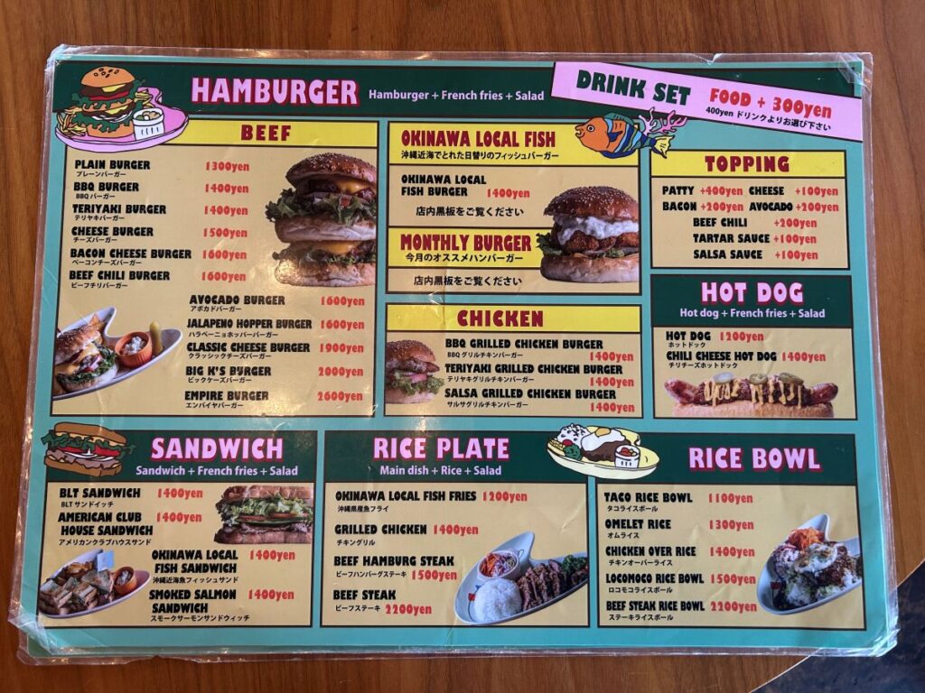 うるま市の外国人住宅街に位置するハンバーガーショップです。レトロアメリカンな外観とポップなカラーが目を引き、店内はアメリカのロードサイドダイナーを思わせるカジュアルな雰囲気。