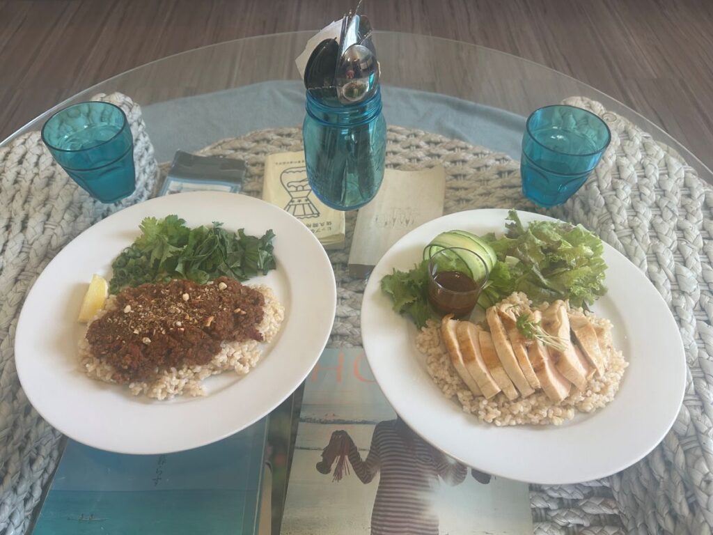 キーマカレー(1,250円)とポーチドチキン&ブラウンライスサラダ(1,250円)はいずれも彩り豊かで、ヘルシー志向の方にも適したメニューです。